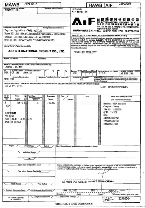 空运进口报关分单(样例)